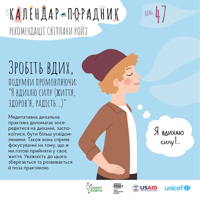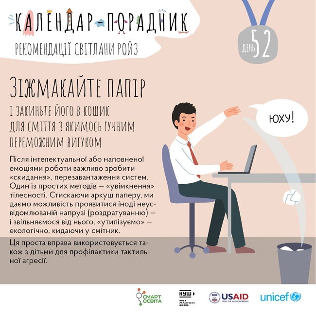Вирватися зі стресового кола допоможе найпростіша йогівська вправа. Заплющить очі й подумки перенесіться на берег океану. Підніміть руки вгору й розведіть у сторони, уявляючи, як у них входить енергія. Складіть їх одна на іншу — ліва знизу. Цього цілком достатньо, щоб повноцінно відпочити, наситити мозок киснем і заспокоїтися. Не забувайте хвалити себе щоразу, коли вам удасться впоратися з хвилюванням.